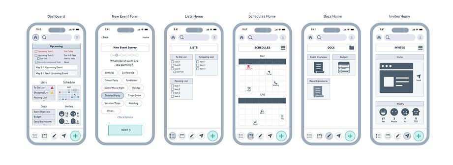 Detailed digital wireframes made it possible to evaluate the effectiveness of the layout. Design decisions including the single-select survey questions inspired by Google Forms, and RSVP icons inspired by Partiful, continued to be effective. The calendar for example cluttered the dashboard and was difficult to interpret at the scale from the lo-fi sketch.